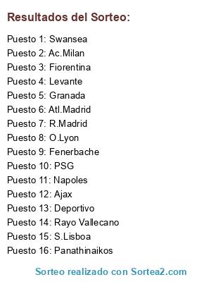 Lista de participantes: Atl.Madrid, Levante, S.Lisboa, Rayo Vallecano, Ajax, PSG, Deportivo, Ac.Milan, O.Lyon, Panathinaikos, Fenerbache, Fiorentina, R.Madrid, Napoles, Swansea, Granada.