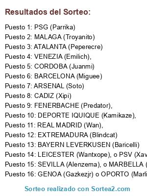 Lista de participantes: PSG (MANSINO), CHELSEA (FISTA)), GETAFE (WANTXOPE), SHAKTAR (GRAVESEN), PASA DIRECTO1, CASTELLON (LIONHEART), , EMPOLI (NAZKAR) u OPORTO (JLIY0), VENEZIA (EMILICH), PASA DIRECTO 2, VALENCIA (ALEPGL), BARCELONA (PEPERECRE), MARSELLA (AYO) -, MAN. UNITED (PESCA),, REAL MADRID (WAN), GRANADA (PES2K21), , CADIZ (CADISTA).