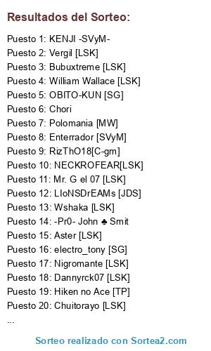 Lista de participantes: Wshaka [LSK], Nigromante [LSK], Mr. G el 07 [LSK], Aster [LSK], Chuitorayo [LSK], Hiken no Ace [TP], Dannyrck07 [LSK], Vergil [LSK], [[Gods Army]] † XElektro †, JuX3r [LSK], Pein [Akatsuki], Bubuxtreme [LSK], RizThO18[C-gm], [[Gods Army]] Dark Master, Enterrador [SVyM], Gaara [D08], -Pr0- John ♣ Smit, K´Dash [LSK], Maligno [DP], William Wallace [LSK], Chori, electro_tony [SG], LIoNSDrEAMs [JDS], IORI2901 [LSK], Polux [LSK], [[Gods Army]] DarkDios, Skager [Akatsuki], Polomania [MW], KENJI -SVyM-, Iron Weasel [NX], OBITO-KUN [SG], NECKROFEAR[LSK].