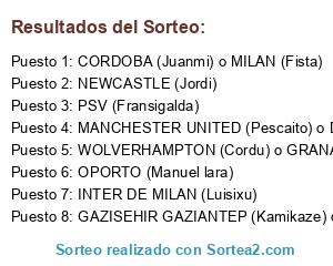 Lista de participantes: PSV (Fransigalda), CORDOBA (Juanmi) o MILAN (Fista), MANCHESTER UNITED (Pescaito) o DEPORTIVO DE LA CORUÑA (Fenoy), GAZISEHIR GAZIANTEP (Kamikaze) o VALENCIA (AlePGL), WOLVERHAMPTON (Cordu) o GRANADA (Blindcat), INTER DE MILAN (Luisixu), OPORTO (Manuel lara), NEWCASTLE (Jordi).