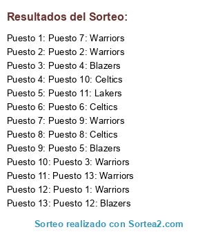 Lista de participantes: Puesto 1: Warriors, Puesto 2: Warriors, Puesto 3: Warriors, Puesto 4: Blazers, Puesto 5: Blazers, Puesto 6: Celtics, Puesto 7: Warriors, Puesto 8: Celtics, Puesto 9: Warriors, Puesto 10: Celtics, Puesto 11: Lakers, Puesto 12: Blazers, Puesto 13: Warriors.