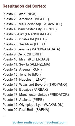 Lista de participantes: Atalanta (PEPE), Castellon (FISTA) o EVERTON (Fuenyol), Manchester City (TONI89), Real Madrid (WAN), Barcelona (MIGUEE), Valencia (ALE), River(ADRI), Milan (KEFERGAS), Schalke 04 (SOTO), Villarreal (NEGRI) o Juventus (LINCEDEO), Manchester United (PREDATOR), Liverpool (PESCA), Osasuna (MASKI), Olympique Lyon (WAKANDU), Bayern Munich (CORDUBITA), Tenerife (MOI), Newcastle United (CIENPORCIENGOIO), Olympique Marsella (LORDPEREZ), Levante (MANUWATAGATA), Sevilla (ALENZEMA), Arsenal (RUPI), Inter Milan (LUISO), Atletico Madrid (DANIORLO)o New York City (JESURE), Ajax (FRANSIGALDA), Real Betis (BAENA), Waasland-Beveren (TROYANO), Lazio (NIKA), Badajoz (FARBAX), Real Sociedad(BLACKWOLF), Napoles (FENOY), Celtic (SHERIFF), Lokomotiv Moscu (ESTUPEYONK).