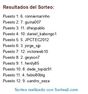 Lista de participantes: 1. herdy85, 2. geyson7, 3. jorge_sjp, 4. fabio80btg, 5. JPCTEC2012, 6. ronniemarinho, 7. guina007, 8. dede_topdz91, 9. uandro_seza, 10. daniel_kabongo1, 11. dheypablo, 12. victorweb10.