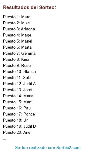 Lista de participantes: Jordi (1), Anna B (1), Judit A (1), Judit D (1), Anna Y (1), Andrea (1), Gemma (1), Krisi (1), Lydie (1), Mage (1), Manel (1), Marc (1), Marta (1), Marti (1), Mikel (1), Ponce (1), Roser (1), Xabi (1), Maria (1), Jusep (1), Lucia (1), Blanca (1), Ariadna (1), Ane (1), Pau (1), Uri (1).