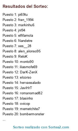 Lista de participantes: alen_alonso95, xes__28, arokita57, memetchite7, hervassalado, Nandetre, fran_1994, romanomad82, adris91, ReloK, markinhu6, bombermonster, cuchurulu, jlamp76, jnl94, maike_irene, blasinho, Maec-HM_93, DarK-ZenX, elcorso, Cristian_David7, paco_elcrack, pi69tu , hijodelgordi , iliasmofe69 , maggiobrc , kevindinho , ovicop , JaviHrT , elfifamola, monto90 , jordan_87_14.