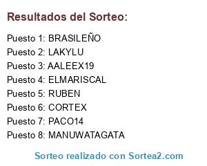 Lista de participantes: AALEEX19, BRASILEÑO, LAKYLU, CORTEX, ELMARISCAL, RUBEN, PACO14, MANUWATAGATA.
