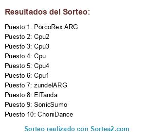 Lista de participantes: zundelARG, ElTanda, SonicSumo, PorcoRex ARG, ChoriiDance, Cpu, Cpu1, Cpu2, Cpu3, Cpu4.