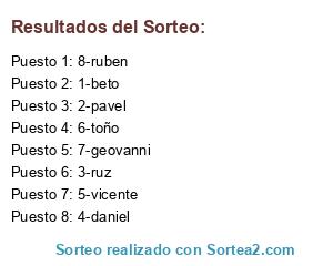 Lista de participantes: 1-beto, 2-pavel, 3-ruz, 4-daniel, 5-vicente, 6-toño, 7-geovanni, 8-ruben.