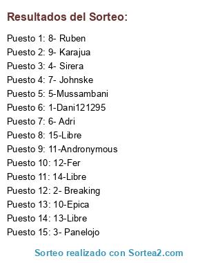 Lista de participantes: 1-Dani121295, 2- Breaking, 3- Panelojo, 4- Sirera, 5-Mussambani, 6- Adri, 7- Johnske, 8- Ruben, 9- Karajua, 10-Epica, 11-Andronymous, 12-Fer, 13-Libre, 14-Libre, 15-Libre.