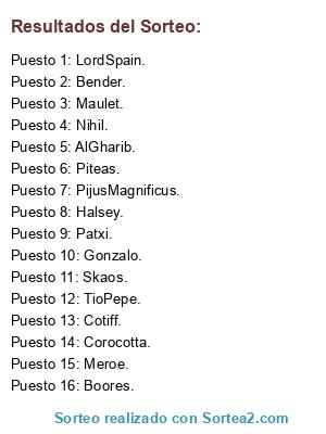 Lista de participantes: Boores. , Skaos. , Halsey. , Nihil. , AlGharib. , Maulet. , Piteas. , TioPepe. , Meroe. , Cotiff. , Corocotta. , Patxi. , LordSpain. , PijusMagnificus. , Gonzalo. , Bender..