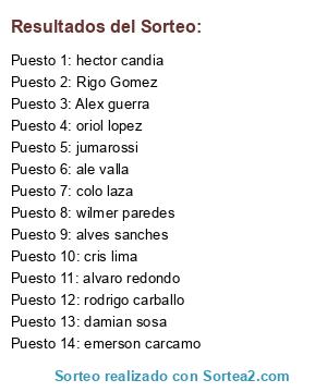 Lista de participantes: Rigo Gomez, Alex guerra, cris lima, alves sanches, hector candia, emerson carcamo, alvaro redondo, jumarossi, ale valla, rodrigo carballo, wilmer paredes, damian sosa, oriol lopez, colo laza.
