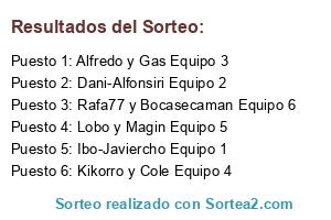 Lista de participantes: Ibo-Javiercho Equipo 1, Dani-Alfonsiri Equipo 2, Alfredo y Gas Equipo 3, Kikorro y Cole Equipo 4, Lobo y Magin Equipo 5, Rafa77 y Bocasecaman Equipo 6.