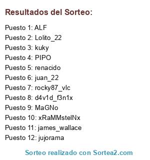 Lista de participantes: d4v1d_f3n1x, xRaMMstelNx, ALF, renacido, rocky87_vlc, Lolito_22, juan_22, PIPO, jujorama, kuky, MaGNo, james_wallace.