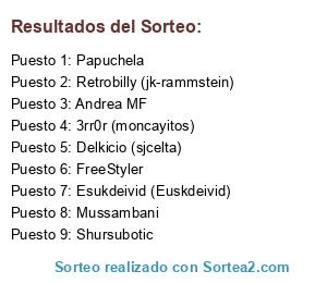 Lista de participantes: Papuchela, Esukdeivid (Euskdeivid), Kemosabi, Chang, Retrobilly (jk-rammstein), Jimmy McNulty (jmcnulty83), Burfok, Over90 (over1990), 3rr0r (moncayitos), Andrea MF, Artic Monkeys (ZigaSpain), Diegoo_avs (=), Samokulini (tu_wifi), Andreuns (andreuns23), Velao !, Jorgito16 ( jorgitho1689), Azraze (new_azraze), Perogrullo (kaiserangel1), Obsolescencia, Delkicio (sjcelta), FreeStyler, LaParsone, Shursubotic, OrcoSiffredi, Mussambani.
