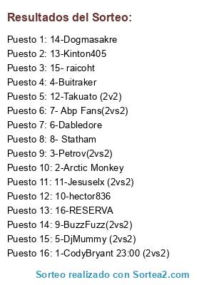 Lista de participantes: 1-CodyBryant 23:00 (2vs2), 2-Arctic Monkey, 3-Petrov(2vs2), 4-Buitraker, 5-DjMummy (2vs2), 6-Dabledore, 7- Abp Fans(2vs2), 8- Statham, 9-BuzzFuzz(2vs2), 10-hector836, 11-Jesuselx (2vs2), 12-Takuato (2v2), 13-Kinton405, 14-Dogmasakre, 15- raicoht, 16-RESERVA.