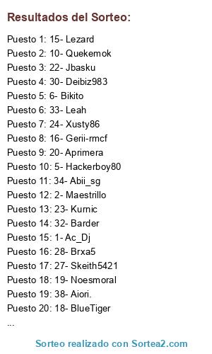 Lista de participantes: 1- Ac_Dj, 2- Maestrillo, 3- Rubio, 4- Partisano, 5- Hackerboy80, 6- Bikito, 7- Wilde_21, 8- Zyxlamonde, 9- Karagounis72, 10- Quekemok, 11- Valzakh, 12- Elhombremagma, 13- Colegita, 14- Andolas, 15- Lezard, 16- Gerii-rmcf, 17- Nastaroth, 18- BlueTiger, 19- Noesmoral, 20- Aprimera, 21- Oscarwani, 22- Jbasku, 23- Kurnic, 24- Xusty86, 25- Iteco, 26- Cocosesamo, 27- Skeith5421, 28- Brxa5, 29- Yiamzat, 30- Deibiz983, 31- MartinLancer, 32- Barder, 33- Leah, 34- Abii_sg, 35- Javisambo (Jlacarra), 36- SergioPe, 37- Cenit, 38- Aiori..