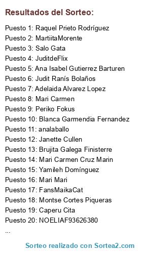 Lista de participantes: Tam Sanchez Sanchez (2 participaciones), Caperu Cita, Raquel Prieto Rodríguez (4 participaciones), Brujita Galega Finisterre, Rosi García Montilla, Esther En Cambrils (3 participaciones), Yamileh Domínguez (3 participaciones), Blanca Garmendia Fernandez (18 participaciones), Judit Ranís Bolaños (3 participaciones), María R Aviles (2 participaciones), Umy Roxy Monster Doll (2 participaciones), Mari Carmen Cruz Marin (2 participaciones), Periko Fokus (5 participaciones), Montse Cortes Piqueras (5 participaciones), Janette Cullen (2 participaciones), Salo Gata (25 participaciones), Ana Isabel Gutierrez Barturen (33 participaciones), Teresa Almendros, Laura Garcia, Rosy Hernandez, Ester Parra Amoros, Adelaida Alvarez Lopez, Neus Galcera Oliva, Mari Mari (22 participaciones), Club de fans Carmen Moraza, Radio Locura, Carmen Moraza (3 participaciones), Mari Carmen, Marisol Moreno Rivero, Noemi Vall Martin, Maricruz Molina Jiménez, Emy Fernan, SaloGata, pamelita13tq, CabreroLuis, maika_mi_vida, PerikoFokus, MartiitaMorente (2 participaciones), CRafaelGomez, RMontila, M59797233, rosimelda73, FansMaikaCat (2 participaciones), Jenifer_Tuu (2 participaciones), JuditdeFlix (2 participaciones), Soniacancela1, PatriciaUrquia, ConRoap, montserep69, AndreaCim94, ibontxu11, NOELIAF93626380, aricompany78, analaballo, Estheros_.
