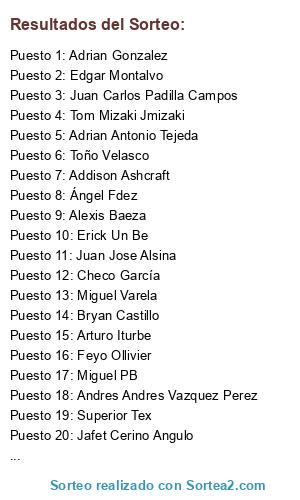 Lista de participantes: Ángel Fdez, Addison Ashcraft, Adrian Gonzalez, Juan Jose Alsina, Carlos Durán, Alex Sánchez, Checo García, Bryan Castillo, Roberto Carlos Lerma, Feyo Ollivier, Miguel PB, Hoch Rodriguez, Toño Velasco, Edgar Montalvo, Gerardo Silva, Jafet Cerino Angulo, Arturo Iturbe, Alexis Baeza, Erick Un Be, FaLlo Agubraa, Ukyses Cl, Tom Mizaki Jmizaki, Moises Arturo Lara, Alan Ramirz, Miguel Varela, Juan Carlos Padilla Campos, Jesus Enrique Macedo Perez Sandi, Luis Felipe Pacheco, Jacobo Garcia, Superior Tex, Adrian Antonio Tejeda, Andres Andres Vazquez Perez.
