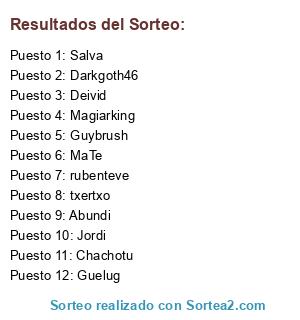 Lista de participantes: rubenteve, Magiarking, MaTe, Guybrush, Salva, Guelug, Jordi, Chachotu, txertxo, Deivid, Abundi, Darkgoth46.