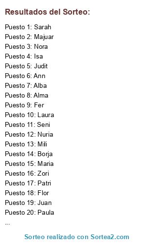 Lista de participantes: Agus, Alba, Alma, Ann, Anny, Borja, Dama, Fer, Flor, Isa, Juan, Judit, Laura, Majuar, Maria, Mili, Nuria, Nora, Patri, Paula, Sarah, Seni, Zori.