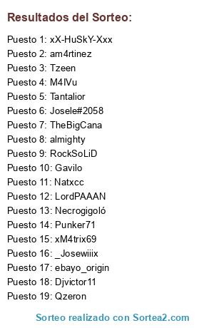 Lista de participantes: M4IVu, almighty(2), RockSoLiD(2), Qzeron, ebayo_origin, am4rtinez(2), Josele#2058(2), Gavilo, xX-HuSkY-Xxx, LordPAAAN(3), Tzeen(6), Djvictor11, Necrogigoló, _Josewiiix, Natxcc, Tantalior(2), Punker71, xM4trix69, TheBigCana.