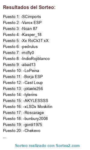 Lista de participantes: -Cast Loup, -Balthier xX, -Varox ESP, -javiferrer, -Xou77, -Jonathanpnk, -Roscarage, -bunbury2008, -Chekevo, -LoPeina, -Xes_28, -Kurosaki Carlos, -Borja ESP, -thegoryss, -carlos 360, -kinectox, -jotaele256, -tylerins, -IndioRojiblanco, -a3boti, -Noan 87, -gordi1975, -Compay22, -Sm Khai, -Xx RoCk3T xX, -SCimports, -xLSDx Moskitin, -pedrulus, -abad13, -AKYLESSSS, -mcfly0, -Kasper_18.