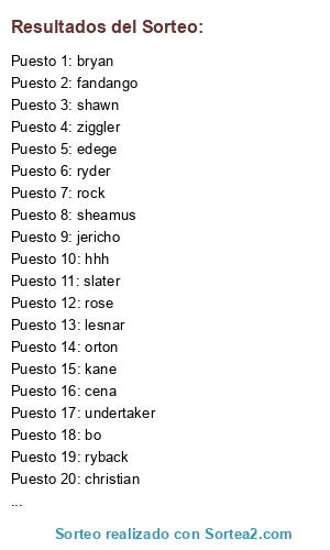 Lista de participantes: rose, bnb, bo, lesnar, jericho, christian, axel, bryan, ambrose, ziggler, edege, fandango, slater, swagger, cena, kane, truth, orton, rock, reigns, rusev, ryback, seth, shawn, sheamus, hhh, undertaker, ryder.