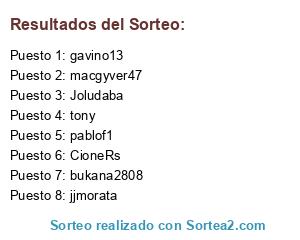 Lista de participantes: bukana2808, CioneRs, gavino13, jjmorata, Joludaba, macgyver47, pablof1, tony.
