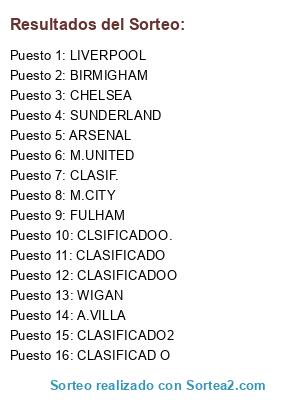 Lista de participantes: BIRMIGHAM, M.CITY, FULHAM, SUNDERLAND, CHELSEA, M.UNITED, LIVERPOOL, ARSENAL, A.VILLA, WIGAN, CLASIFICADO, CLASIFICADOO, CLASIFICADO2, CLASIF., CLASIFICAD O, CLSIFICADOO..