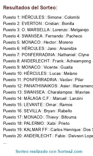 Lista de participantes: BETIS Pablo Sarabia, ANDERLECHT Adil Rami, ANDERLECHT Alex Grimaldo, ANDERLECHT Alex Sandro Lobo Silva, ANDERLECHT Amin Affane, ANDERLECHT Andy Najar, ANDERLECHT Brad Friedel, ANDERLECHT Callum Reilly, ANDERLECHT Clement Grenier, ANDERLECHT Daniel Amartey, ANDERLECHT Edgar Salli, ANDERLECHT Erik Nascimento Lima, ANDERLECHT Ezequiel Lavezzi, ANDERLECHT Fabio Deivson Lopes Maciel, ANDERLECHT Frank Acheampong, ANDERLECHT German Denis, ANDERLECHT Ibrahima Mbaye, ANDERLECHT Joao Miranda de Souza, ANDERLECHT Karim Benzema, ANDERLECHT Lucas Silva Borges, ANDERLECHT Marco Sau, ANDERLECHT Marcos (Marquinhos) Aoas Correa, ANDERLECHT Massimo Bruno, ANDERLECHT Mathew Ryan, ANDERLECHT Matias Suarez, ANDERLECHT Matteo Bianchetti, ANDERLECHT Mohamed Elyounoussi, ANDERLECHT Moritz Leitner, ANDERLECHT Mourez Hassen, ANDERLECHT Nuri Sahin, ANDERLECHT Oliver Torres, ANDERLECHT Rodolfo Pizarro, ANDERLECHT Ruben Vezo, ANDERLECHT Sebastian Jung, ANDERLECHT Serigne Kara, ANDERLECHT Soualiho Meite, ANDERLECHT Thomas Strakosha, ANDERLECHT Zana Allee, ANDERLECHT Ze Roberto da Silva Junior, ATH. BILBAO Andoni Iraola, ATH. BILBAO Antonio Nocerino, ATH. BILBAO Aritz Aduriz, ATH. BILBAO Calum Chambers, ATH. BILBAO Carles Puyol, ATH. BILBAO Carlos Gurpegi, ATH. BILBAO Danilo Cataldi, ATH. BILBAO Eron Santos, ATH. BILBAO Fernando Amorebieta, ATH. BILBAO Fernando Llorente, ATH. BILBAO Filip Helander, ATH. BILBAO Gregor Zabret, ATH. BILBAO Guillermo Fernandez Hierro, ATH. BILBAO Jonathan Tah, ATH. BILBAO Jorge Guajardo, ATH. BILBAO Kepa Arrizabalaga, ATH. BILBAO Kevin Volland, ATH. BILBAO Levin Oztulani, ATH. BILBAO Lucas Andersen, ATH. BILBAO Luis Felipe Dias do Nascimento, ATH. BILBAO Luiz Antonio de Souza Soares, ATH. BILBAO Luiz Filipe Lima de Oliveira Muralha, ATH. BILBAO Maicon, ATH. BILBAO Mario Suarez, ATH. BILBAO Markel Susaeta, ATH. BILBAO Mathieu Valbuena, ATH. BILBAO Matias Navarrete, ATH. BILBAO Mikel Arteta, ATH. BILBAO Mikel San Jose, ATH. BILBAO Nacho Monreal, ATH. BILBAO Nicolas Gaitan, ATH. BILBAO Robert Hall, ATH. BILBAO Roberto Jimenez, ATH. BILBAO Shaun Hutchinson, ATH. BILBAO Taxiarchis Fountas, ATH. BILBAO Tiago Rafael Silva, ATH. BILBAO Vieirinha, ATH. BILBAO Xavi Hernandez, BETIS Adrian San Miguel del Castillo, BETIS Alejandro Arribas, BETIS Alexandre Coeff, BETIS Alvaro Vadillo, BETIS Bruno Alves, BETIS Carlos Garcia, BETIS Cedric Soares, BETIS Cedrik Mabwati Gerard, BETIS Didac Vila, BETIS Diego Costa, BETIS Erik Lamela, BETIS Gabriel Paulista Armando Abreu, BETIS Georg Niedermeier, BETIS Jesus Joaquin Suso, BETIS Joan Verdu, BETIS Joao Paulo Pereira da Silva, BETIS Joel Campbell, BETIS Jonathan Henry Bond, BETIS Jorge Molina, BETIS Jose Alberto Cañas, BETIS Juan Carlos Perez, BETIS Juan Miguel Jimenez Lopez Juanmi, BETIS Lorenzo Enrique Reyes Vicencio, BETIS Mario Balotelli, BETIS Mario Sampirisi, BETIS Miralem Pjanic, BETIS Miroslav Stoch, BETIS Moises Gomez Bordonado, BETIS Nono Delgado Villar, BETIS Nosa Igiebor, BETIS Orlando Ruben Yañez Alabart, BETIS Oscar Gil Oses, BETIS Ruben Castro, BETIS Sebastien Bassong, BETIS Sebastien Corchia, BETIS Sergio Rodriguez Hurtado, BETIS Thibaut Courtois, BETIS Xavier Quintilla Guasch, BETIS Zhi Gin Andreas Lam, DINAMO DE MOSCU Adem Ljajic, DINAMO DE MOSCU Alan Gatagov, DINAMO DE MOSCU Alberto Masi, DINAMO DE MOSCU Alessandro Florenzi, DINAMO DE MOSCU Alex Oxlade-Chamberlain, DINAMO DE MOSCU Alex Pritchard, DINAMO DE MOSCU Alexander Kokorin, DINAMO DE MOSCU Andre Carrillo, DINAMO DE MOSCU Andrey Panyukov, DINAMO DE MOSCU Anton Shunin, DINAMO DE MOSCU Antonio Jose Pinheiro de Carvalho (Toze), DINAMO DE MOSCU Asmir Begovic, DINAMO DE MOSCU Aymeric Laporte, DINAMO DE MOSCU Balazs Dzsudzsak, DINAMO DE MOSCU Christian Noboa, DINAMO DE MOSCU Cristian Eriksen, DINAMO DE MOSCU David Abraham, DINAMO DE MOSCU Dmitri Otstavnov, DINAMO DE MOSCU Ebenezer Assifuah, DINAMO DE MOSCU Facundo Roncaglia, DINAMO DE MOSCU Iñigo Ruiz de Galarreta, DINAMO DE MOSCU Joao Cancelo, DINAMO DE MOSCU Jordan Ikoko, DINAMO DE MOSCU Jordy Clasie, DINAMO DE MOSCU Jorge Jonathan Espericueta, DINAMO DE MOSCU Julian Velazquez, DINAMO DE MOSCU Kenneth Vermeer, DINAMO DE MOSCU Kevin Kuranyi, DINAMO DE MOSCU Kieran Gibbs, DINAMO DE MOSCU Lucas Candido, DINAMO DE MOSCU Lucas Rodriguez, DINAMO DE MOSCU Luke Wilkshire, DINAMO DE MOSCU Menn Koch, DINAMO DE MOSCU Modibo Diakite, DINAMO DE MOSCU Nemaja Matic, DINAMO DE MOSCU Nigel Bertrams, DINAMO DE MOSCU Nikita Chicherin, DINAMO DE MOSCU Niklas Moisander, DINAMO DE MOSCU Rodrigo Ely, DINAMO DE MOSCU Ruben Blanco, DINAMO DE MOSCU Tony Jantschke, EVERTON Abdoulay Konko, EVERTON Alvaro Pereira, EVERTON Anthony Limbombe Ekango, EVERTON Bartolomej Pawlowski, EVERTON Bruno Martins Indi, EVERTON Carlos Fierro, EVERTON Cristian Bonilla, EVERTON Daley Blind, EVERTON Danny Hoesen, EVERTON David Costas, EVERTON Davy Klaassen, EVERTON Diego Alves, EVERTON Edinson Cavani, EVERTON Etienne Capoue, EVERTON Gareth Bale, EVERTON Georginio Wijnaldum, EVERTON Giannelli Imbula, EVERTON Ilan Boccara, EVERTON Ilkay Gundogan, EVERTON Jakub Blaszczykowski, EVERTON Jerome Boateng, EVERTON Jordan Lukaku, EVERTON Jose Cevallos, EVERTON Jose Gaya, EVERTON Kenneth Omeruo, EVERTON Luiz Eduardo, EVERTON Michael Rensing, EVERTON Mickey Van der Hart, EVERTON Richairo Zivkovic, EVERTON Rodrigo Gomez, EVERTON Ryan Bertrand, EVERTON Simone Zaza, EVERTON Sofiane Feghouli, EVERTON Stefano Denswil, EVERTON Terence Kongolo, EVERTON Thomas Teye Partey, EVERTON Valon Behrami, EVERTON Viktor Fischer, EVERTON Yassin Ayoub, G. RANGERS Aaron Lennon, G. RANGERS Achille Emana, G. RANGERS Aleksandr Flitsov, G. RANGERS Alessandro Gamberini, G. RANGERS Denis Glushakov, G. RANGERS Didier Drogba, G. RANGERS Guilherme Alvim Marinato, G. RANGERS Jefferson Montero, G. RANGERS Juan Ghilherme Nunes Jesus, G. RANGERS Lass Bangoura, G. RANGERS Lucas Pierre Santos Oliveira, G. RANGERS Luciano Narsingh, G. RANGERS Mickael Landreau, G. RANGERS Miroslav Lobantsev, G. RANGERS Simon Ro