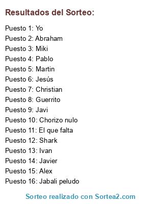 Lista de participantes: Pablo, Ivan, Javier, Martin, Christian, Guerrito, Shark, Alex, Chorizo nulo, Miki, Abraham, Jesús, Javi, Yo, Jabali peludo, El que falta.
