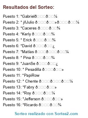 Lista de participantes: *Kerly 👍🏾, *PapiRow, * Pina 👍🏾, *Caceres 👍🏾, * Erick 👍🏾, * jñJulio 👍🏻💅🏼, *David 👍🏿, *Gabriel👍🏼, *Jefferson 👍🏻, *Fabry 👍🏻, *Matías 👍💅🏼, *Ricardo 👍🏾, *Roy 👍🏼, *JuanSe 👍🏿, * Chente 🖕💅🏼, * Pesadilla 👍🏻.