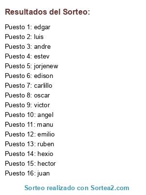 Lista de participantes: estev, ruben, emilio, jorjenew, juan, angel, edison, hector, hexio, victor, edgar, luis, andre, oscar, carlillo, manu.