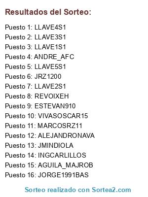 Lista de participantes: ESTEVAN910, REVOIXEH, INGCARLILLOS, AGUILA_MAJROB, VIVASOSCAR15, MARCOSRZ11, JORGE1991BAS, JRZ1200, JMINDIOLA, ALEJANDRONAVA, ANDRE_AFC, LLAVE1S1, LLAVE2S1, LLAVE3S1, LLAVE4S1, LLAVE5S1.