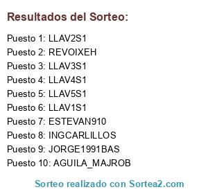Lista de participantes: INGCARLILLOS, AGUILA_MAJROB, ESTEVAN910, REVOIXEH, JORGE1991BAS, LLAV1S1, LLAV2S1, LLAV3S1, LLAV4S1, LLAV5S1.
