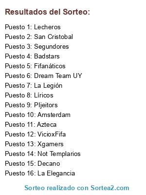 Lista de participantes: PIjeitors, La Elegancia, Segundores, San Cristobal, Líricos, VicioxFifa, Xgamers, Azteca, Fifanáticos, Not Templarios, Badstars, Amsterdam, La Legión, Dream Team UY, Lecheros, Decano.