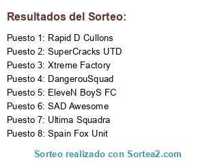 Lista de participantes: EleveN BoyS FC, Xtreme Factory, Spain Fox Unit, Ultima Squadra, Rapid D Cullons, DangerouSquad, SuperCracks UTD, SAD Awesome.