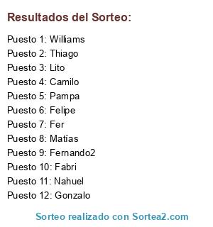 Lista de participantes: Fer, Pampa, Fernando2, Gonzalo, Lito, Williams, Camilo, Felipe, Matías, Fabri, Thiago, Nahuel.