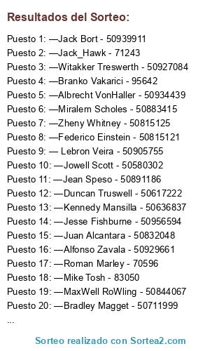 Lista de participantes: —Stanley Kaponni - 49576, —Brian Strauss, —Jorge Nikias, —Alex Sniff - 50592388, —Kenneth Wild - 71551, —Alysha Lysenkova - 64600, —Valeria Shadowsong - 71772, —Marshall Bouffard - 58528, —Hawking Hemsworth - 70755, —Leroy WIlliams - 50810632, —Miguel Duchess - 50787569, —Carlos Reigosa - 50764599, —Moises Montana - 50720014, —Carlo Mancini - 50905185, —Feng Wang - 50585387, —Nicolas Novak - 90852, —Thakes Hiennsth - 50739099, —Friedrich Brobeck - 50899456, —Djezon Sharked - 50781971, —Alejandro Hunt - 50963228, —Riderick Plasox - 232123, — Dave braugher - 50833899, —Dean Hughes - 50963751, —Matías Jung - 50760629, —Jason Kingston - 52906, —Carlos Rickles - 50817002, —Huang Yang - 50700917, —Nipsel Hussley - 48817, —German Braga - 50615708, —Guy Buckland - 50878315, —Christian Sandoval - 17383, —Jowell Scott - 50580302, — Lebron Veira - 50905755, —Jean Speso - 50891186, —Duncan Truswell - 50617222, —Brayden Santana - 418309., —Kennedy Mansilla - 50636837, —Federico Einstein - 50815121, —Zheny Whitney - 50815125, —Jack_Hawk - 71243, —Jack Bort - 50939911, —Witakker Treswerth - 50927084, —Branko Vakarici - 95642, —Miralem Scholes - 50883415, —Albrecht VonHaller - 50934439, —Jesse Fishburne - 50956594, —Juan Alcantara - 50832048, —Jack Growsher - 50100730, —John Cardona - 50842616, —Rashard Mancini - 50908241, —Jordy Sar - 50776138, —Juan Montenegro - 50149565, —Diego Silvav - 50603913, —James Sweet - 83439, —Roman Marley - 70596, —Alfonso Zavala - 50929661, —Mike Tosh - 83050, —MaxWell RoWling - 50844067, —Folker Deutscher - 41153, —Bradley Magget - 50711999.