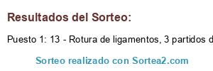 Lista de participantes: 1 - Simple susto, no le ocurrió nada, 2 - Herida superficial, no le ocurrió nada, 3 - Traumatismo leve, no le ocurrió nada, 4 - Contusión, no le ocurrió nada, 5 - Gastroenteritis, no le ocurrió nada, 6 - Esguince leve, 1 partido de baja, 7 - Gripe, 1 partido de baja, 8 - Sobrecarga muscular, 1 partido de baja, 9 - Microrotura fibrilar, 1 partidos de baja, 10 - Esguince de rodilla, 2 partidos de baja, 11 - Esguince grave, 2 partidos de baja, 12 - Desgarro fibrilar, 2 partidos de baja, 13 - Rotura de ligamentos, 3 partidos de baja, 14 - Rotura fibrilar, 3 partidos de baja, 15 - Rotura de menisco, 4 partidos de baja.