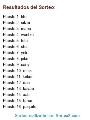 Lista de participantes: wantxo, paquito, turco, tito, mario, silver, tete, xabi, stur, kelus, carly, dani, kayao, jeke, yeli, erick.