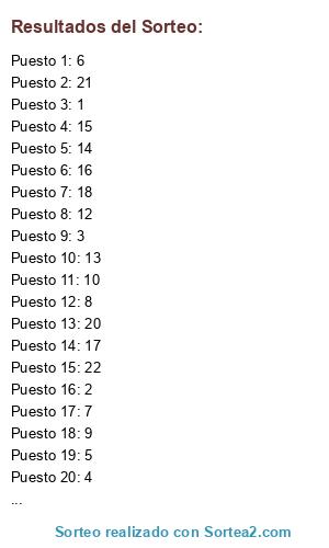Lista de participantes: 1, 2, 3, 4, 5, 6, 7, 8, 9, 10, 11, 12, 13, 14, 15, 16, 17, 18, 19, 20, 21, 22.