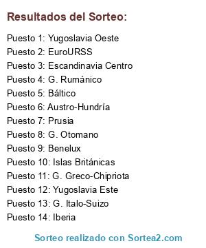 Lista de participantes: Escandinavia Centro, EuroURSS, G. Rumánico, G. Greco-Chipriota, G. Otomano, G. Italo-Suizo, Austro-Hundría, Prusia, Báltico, Iberia, Yugoslavia Este, Yugoslavia Oeste, Islas Británicas, Benelux.