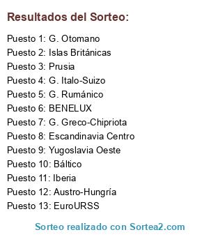 Lista de participantes: Escandinavia Centro, Yugoslavia Oeste, Iberia, G. Rumánico, G. Otomano, G. Italo-Suizo, Austro-Hungría, G. Greco-Chipriota, BENELUX, Báltico, Islas Británicas, Prusia, EuroURSS.