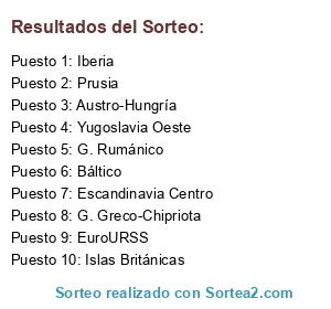 Lista de participantes: Islas Británicas, G. Greco-Chipriota, Escandinavia Centro, EuroURSS, Prusia, Báltico, Iberia, Austro-Hungría, Yugoslavia Oeste, G. Rumánico.