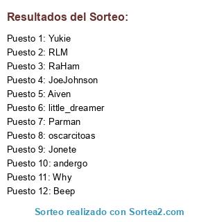 Lista de participantes: RaHam, oscarcitoas, little_dreamer, Why, Aiven, Yukie, RLM, andergo, Beep, Parman, Jonete, JoeJohnson.