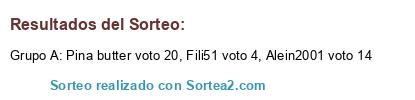 Lista de participantes: Dark lio0n voto 1, Fili51 voto 4, tauro76 voto 8, tizoq voto 9, Erwin glez voto 10, 0MeRcEnArIo0 voto 11, Speedy Gonzales 2013 voto 12, Alein2001 voto 14, robert nicolas voto 15, mike29031993 voto 18, Pina butter voto 20, Moisesnv voto 22.