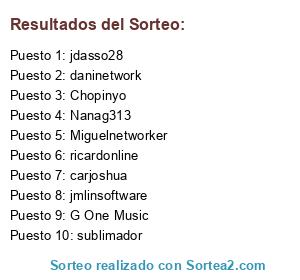 Lista de participantes: Miguelnetworker(33 participaciones), ricardonline(23 participaciones), Nanag313(15 participaciones), venespain73(11 participaciones), carjoshua(11 participaciones), daninetwork(11 participaciones), jmlinsoftware(11 participaciones), G-One-Music(11 participaciones), sublimador(9 participaciones), Chopinyo(8 participaciones).