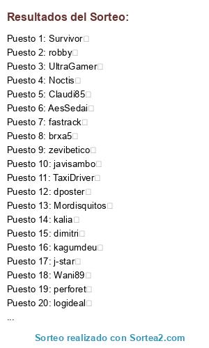 Lista de participantes: melfenos (20 participaciones), Wani89 (20 participaciones), kalia (20 participaciones), gangaman (20 participaciones), perforet (20 participaciones), brxa5 (20 participaciones), javisambo (20 participaciones), dposter (20 participaciones), kagumdeu (20 participaciones), robby (20 participaciones), CujaNu (20 participaciones), fastrack (20 participaciones), Lemansky (20 participaciones), Claudi85 (20 participaciones), Vegas (20 participaciones), zevibetico (20 participaciones), logideal (20 participaciones), Bender (20 participaciones), sorbete (20 participaciones), j-star (20 participaciones), Osgurd (20 participaciones), AesSedai (20 participaciones), cucusha (20 participaciones), Survivor (20 participaciones), UltraGamer (20 participaciones), Aristopato (20 participaciones), Clash (20 participaciones), Noctis (20 participaciones), Mordisquitos (20 participaciones), VicMackey (20 participaciones), TaxiDriver (20 participaciones), Hepatocito (20 participaciones), Maurice (7 participaciones), ElGuardian (6 participaciones), titorober (5 participaciones), StemCell (5 participaciones), xtuu (5 participaciones), hewok (4 participaciones), Oxymoron (3 participaciones), Jrios84 (3 participaciones), Rioga (3 participaciones), RJzaiR (3 participaciones), Naimarc (2 participaciones), dimoca (2 participaciones), Sunsunat (2 participaciones), Macintosh (2 participaciones), Sergiio (2 participaciones), juanjicoo (2 participaciones), dimitri (2 participaciones), MaraRM (2 participaciones), Mercedes (2 participaciones), andolas , jm24cule , zoler , mankur , jbasku.
