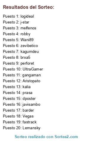 Lista de participantes: melfenos (5 participaciones), prasa (4 participaciones), Wani89 (3 participaciones), perforet (2 participaciones), gangaman (2 participaciones), kalia (2 participaciones), javisambo (2 participaciones), brxa5 (2 participaciones), zevibetico (2 participaciones), fastrack (2 participaciones), dposter , kagumdeu , barder , logideal , UltraGamer , j-star , Vegas , Lemansky , Aristopato , robby.